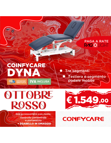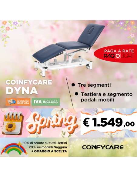 Il lettino elettrico Dyna è un lettino a tre sezioni con alcuni particolarità. La testiera per misure è più simile ad uno schienale ovviamente movimentabile in positivo e negativo; allo stesso tempo il segmento podale ha diverse angolazioni in positivo e negativo gli permettono di divenire quasi una poltrona.