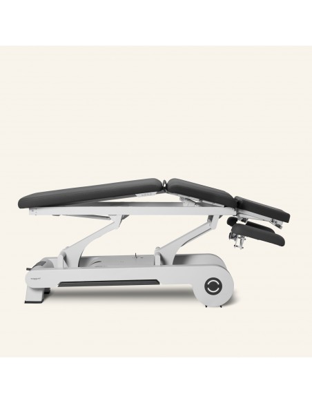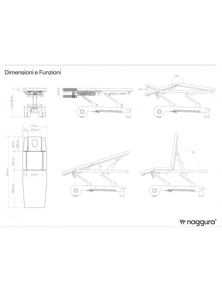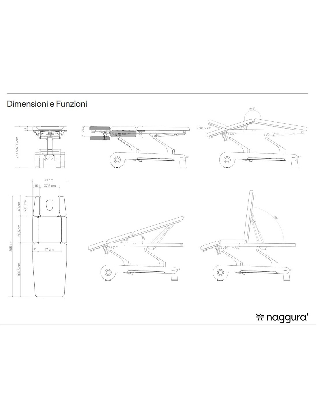 Le sue sezioni consentono di attivare le posizioni di Trendelenburg, gobba di cammello e cifosi per trattamenti lombari e di poltrona da massaggio.
