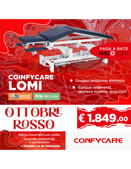 Il lettino Lomi è un lettino a cinque sezioni con doppio motorino elettrico e testiera divisa in tre segmenti. Adatto alla terapia manuale, offre un'ottima stabilità durante i trattamenti osteopatici I due bracci d'alzata donano al prodotto una estrema stabilità, tale da non perdere la forza del trattamento sia con pazienti più pesanti che meno.